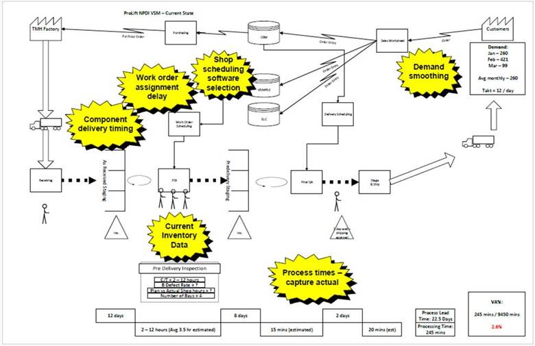 One of the tools used during this process was a Value Stream Map (also known as a Material and Information Flow Chart), which helps visualize waiting and inventory wastes in a process to logically prioritize improvement activities and address the most significant process issues first.