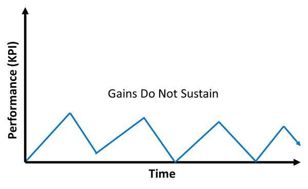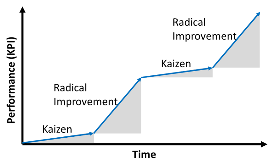 | Hoshin Kanri (HK): HK focuses on significant targeted changes to the business. If only large strategic initiatives are the focus, improvement gains will occur, but those gains will rarely be sustained over time. Therefore, performance fluctuation will be significant. | ![]() |