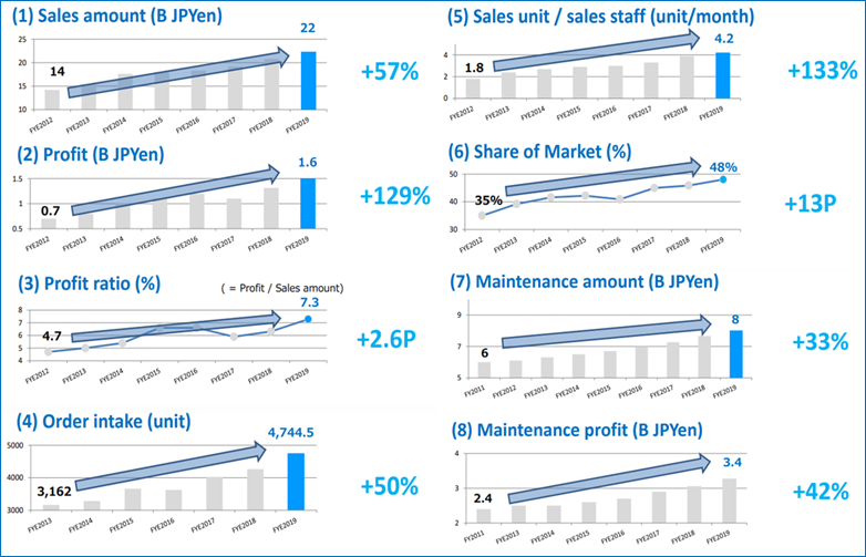 After years of activity and following the daily management and Hoshin Kanri processes, top-level metrics in the company improved year over year. Drastic improvements can be seen in three key metrics (Profit, Profit Ratio, and Sales Units per Sales Staff) following changes to the business Hoshin Kanri activities. Through top management’s commitment and focus on Toyota Lean Management, L&F Kinki is able to continually improve its efficiency, contributing to its vision of supporting customers, employees, and society with measurable results.